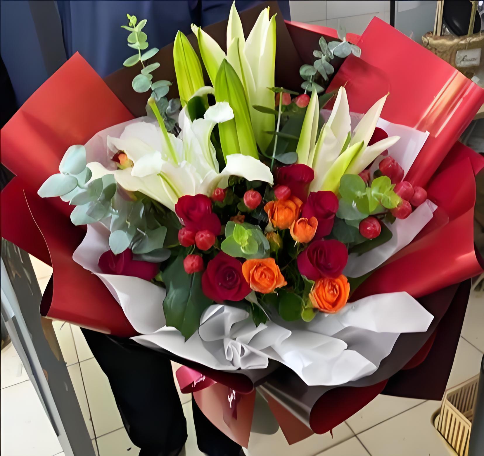 珠海花店包11枝红玫瑰、2枝多头白百合、6枝橙色多头玫瑰、红豆、尤加利叶
